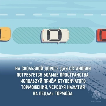 Помните, что на скользкой дороге тормозной путь автомобиля увеличивается в несколько раз. В обычных условиях безопасная дистанция составляет 3-4 секунды, но при обледенении дороги эту цифру нужно увеличить в два, а то и в три раза. При торможении используйте приём ступенчатого торможения, чередуя нажатия на педаль тормоза.