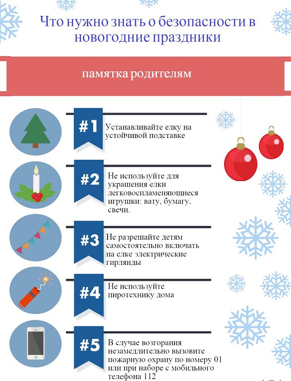Уважаемые родители! Приближаются новогодние праздники и зимние каникулы – самое чудесное и долгожданное время для детей и взрослых. Игры, забавы вокруг зеленой красавицы надолго остаются в памяти детей. Мы искренне надеемся, что они будут радостными. Но не стоит забывать, что именно в период праздничных дней дома, на прогулках и в гостях Вас могут поджидать самые неожиданные опасные ситуации. Бенгальские огни, хлопушки, петарды, снежные горки, ледянки, санки и коньки – все это не только приносит радость, но и может огорчить травмами, ушибами, порезами и ожогами. Чтобы избежать их или максимально сократить риск воспользуйтесь следующими правилами: